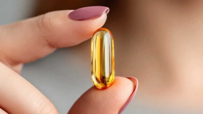 A hand holds a softgel capsule that represents supplements after 50 choices